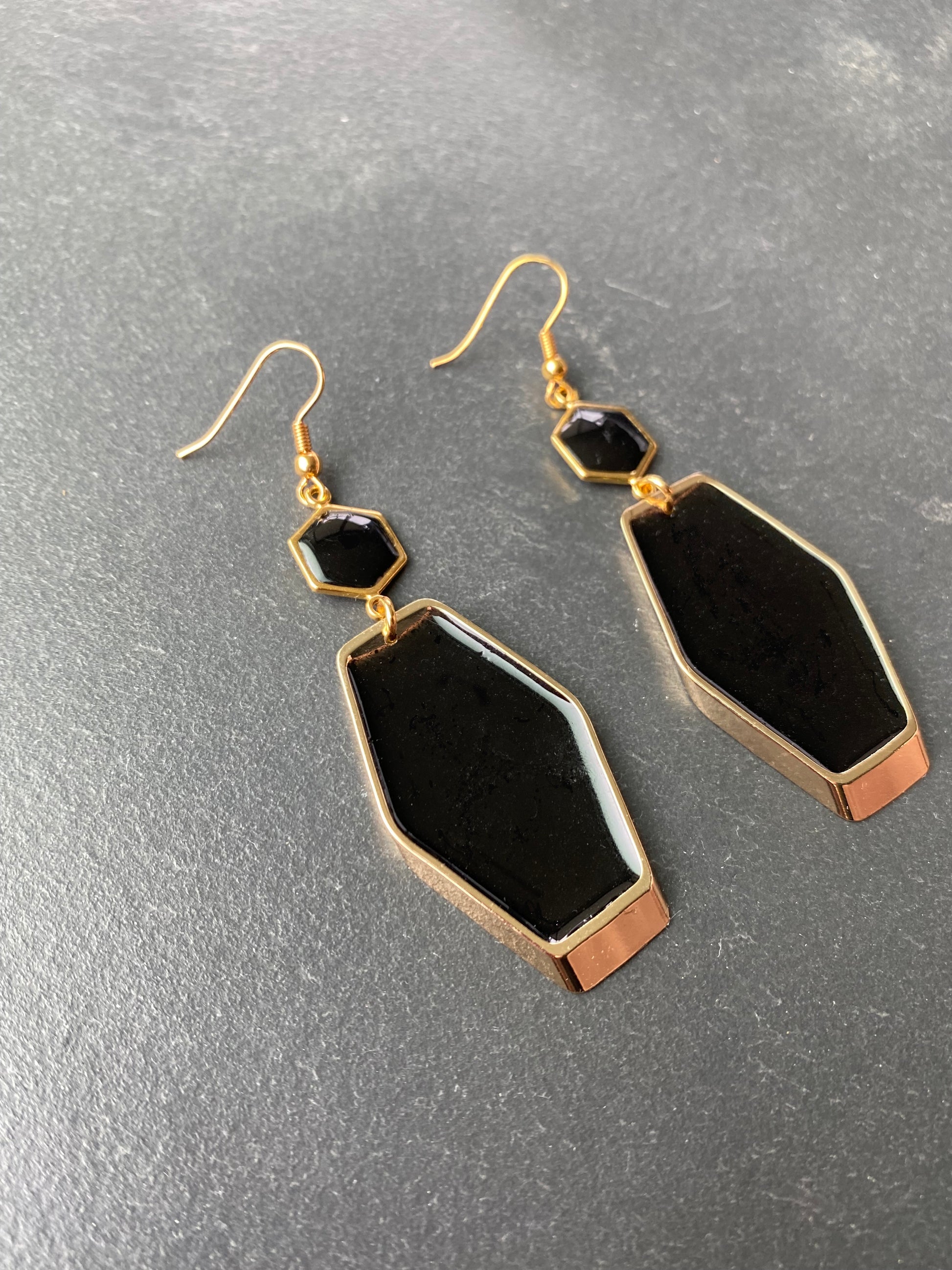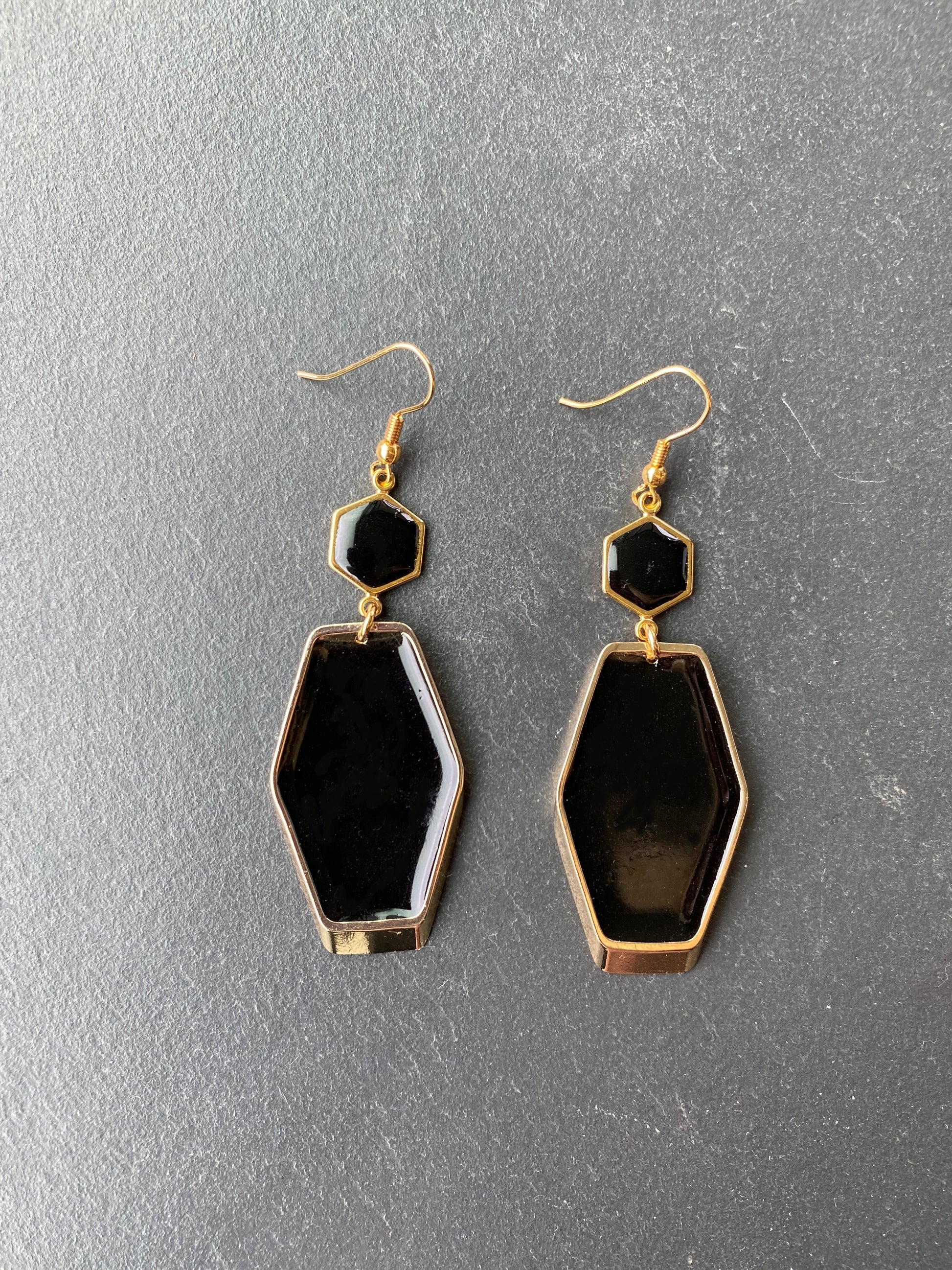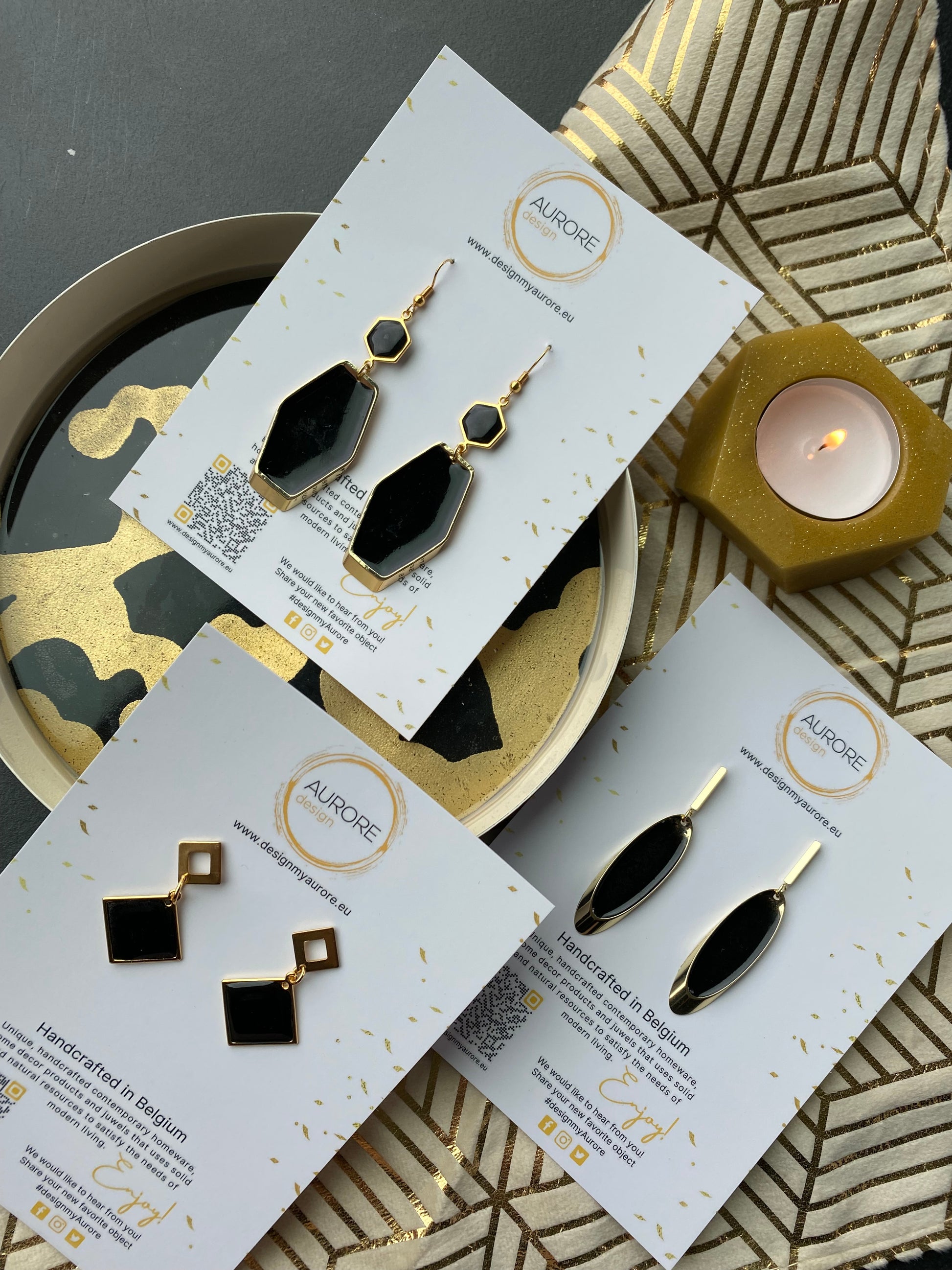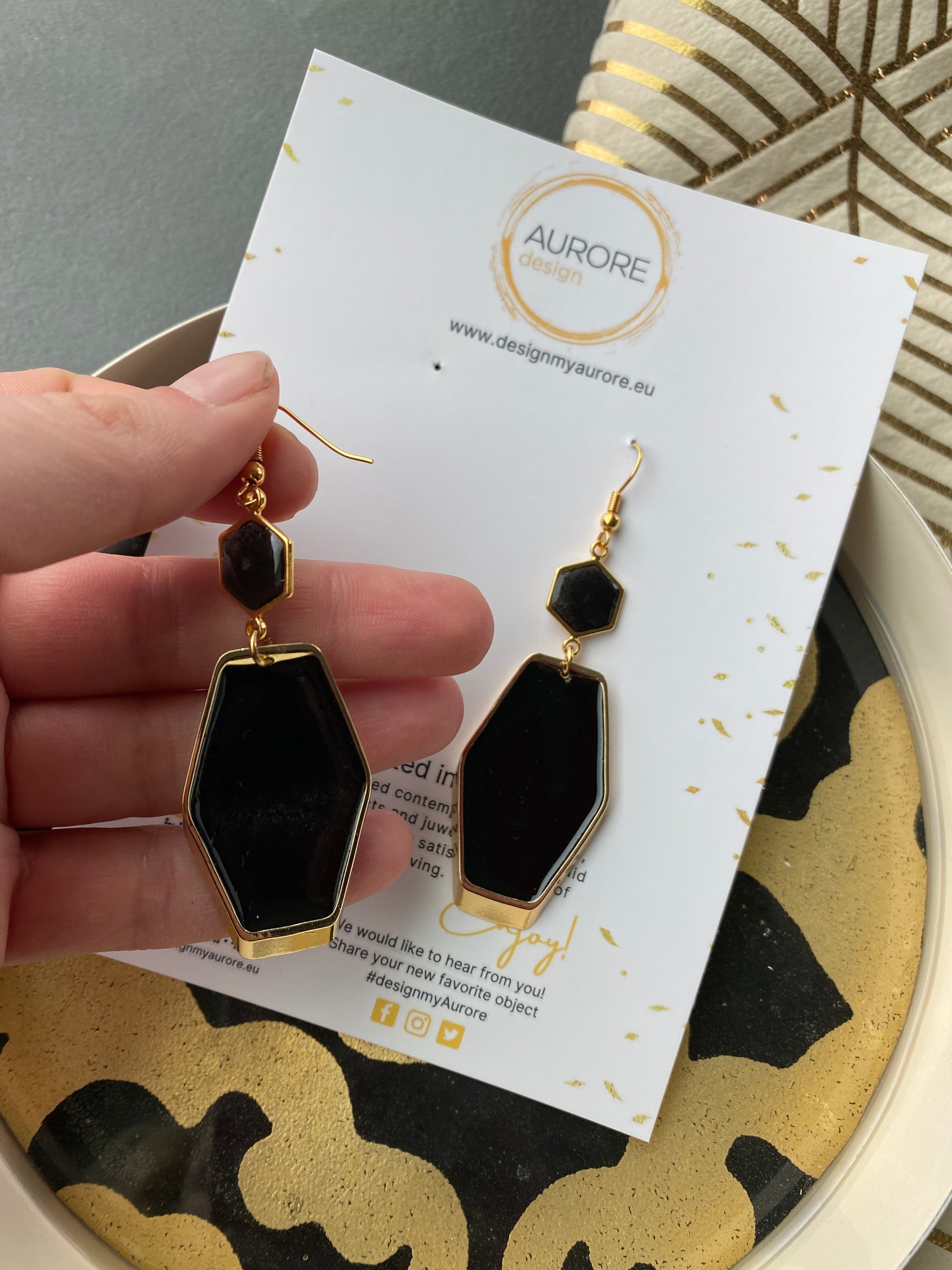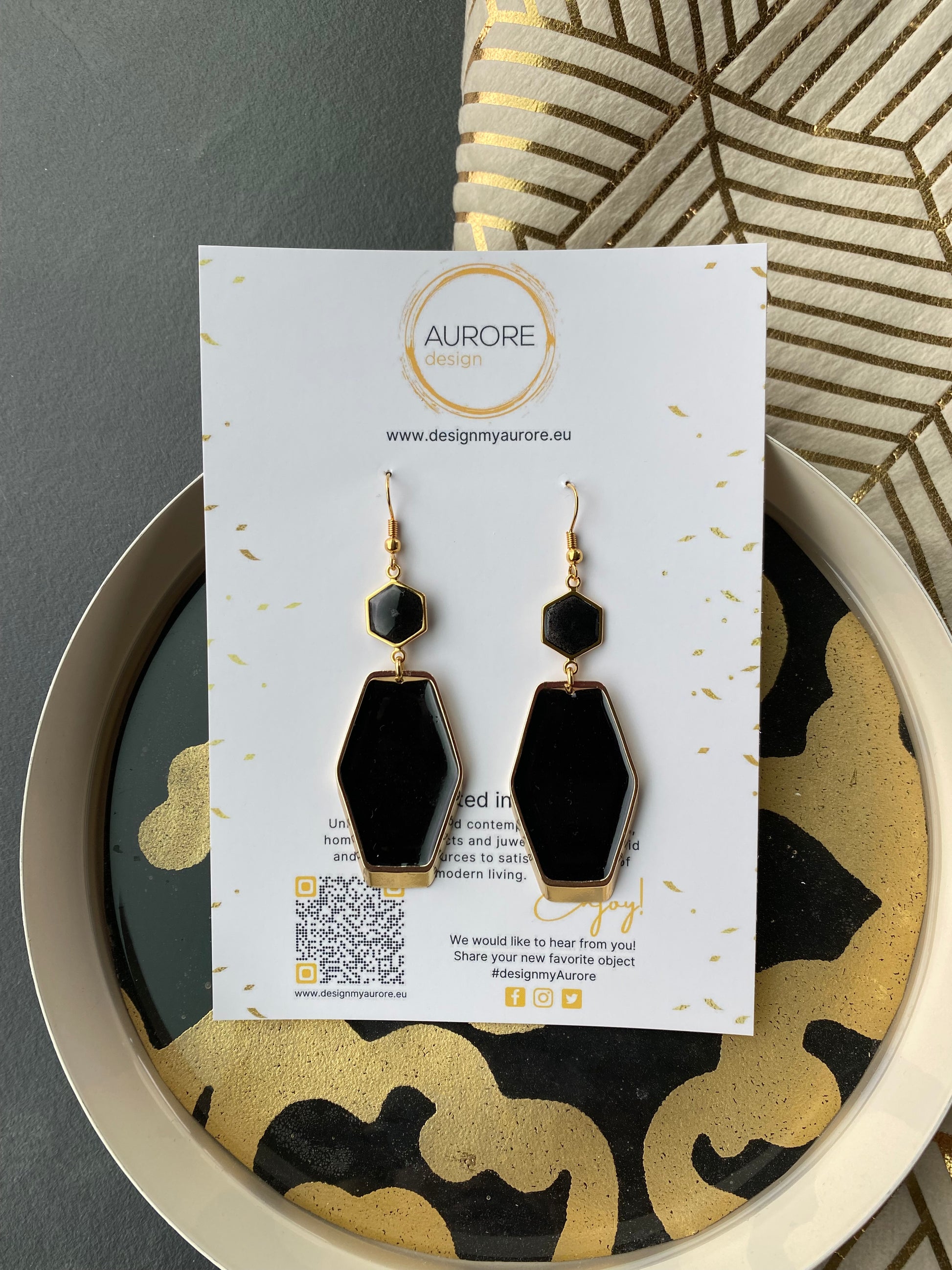 Prachtige tijdloze geometrische statement oorbellen met zwarte licht transparante resin inleg. Ondanks hun lengte echte lichtgewichten waardoor ze makkelijke dagelijks kunnen gedragen worden.