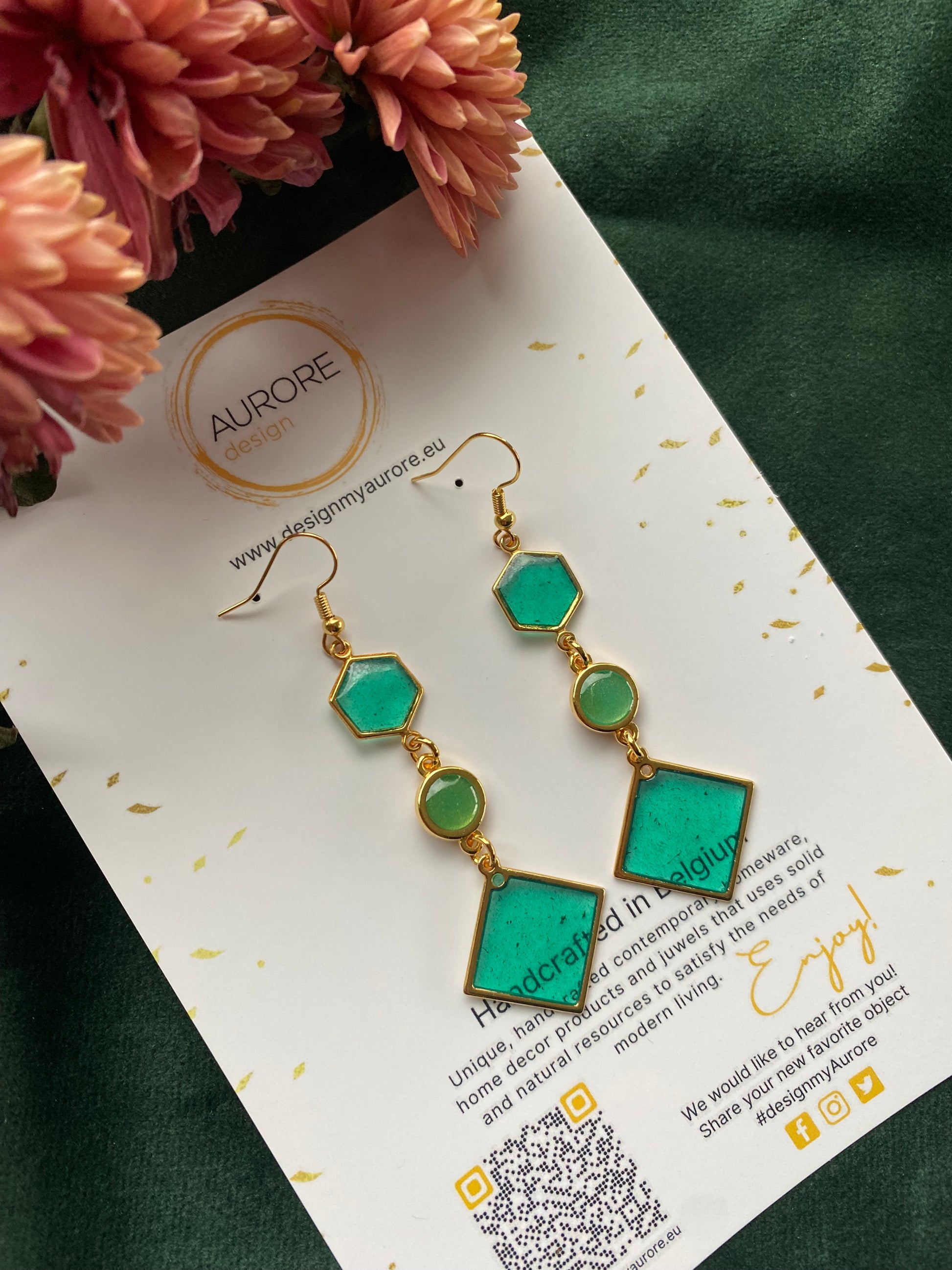 Deze veelzijdige oorbellen zijn tijdloos en vrouwelijk en maken je outfits direct speciaal. Het unieke paar is voorzien van groene geometrische vormen en heeft een gouden rand. De oorbellen zijn ontworpen voor oren met gaatjes.
